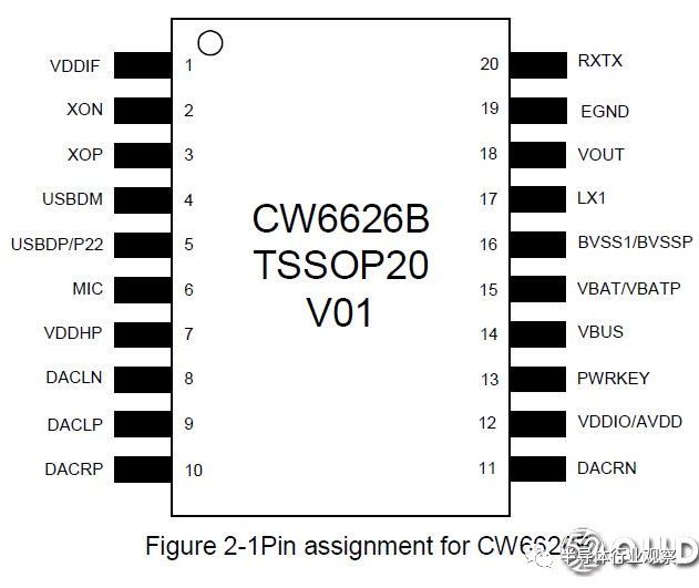 建荣 CW6626B内建LDO,降压DC-DC,电池充电。采用TSSOP20封装。支持电池电压2.7-4.25V,充电输入电压4.75-5.75V,内置通话音频改善算法,内建浮点处理器,内置135K SRAM,内建4M FLASH。